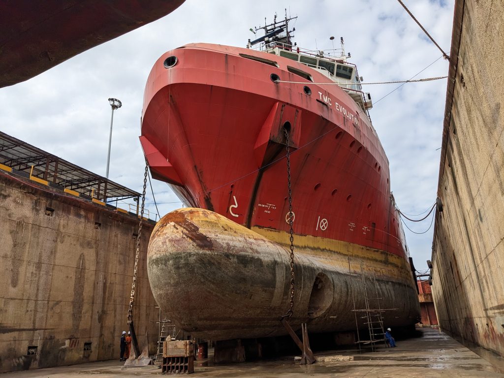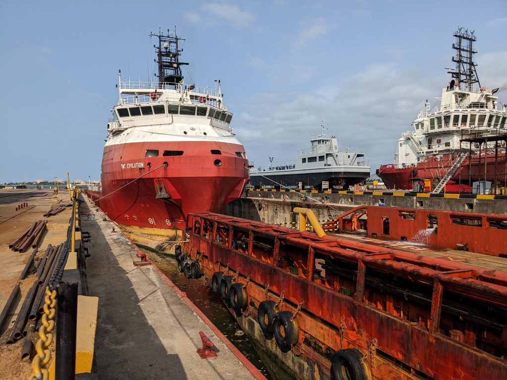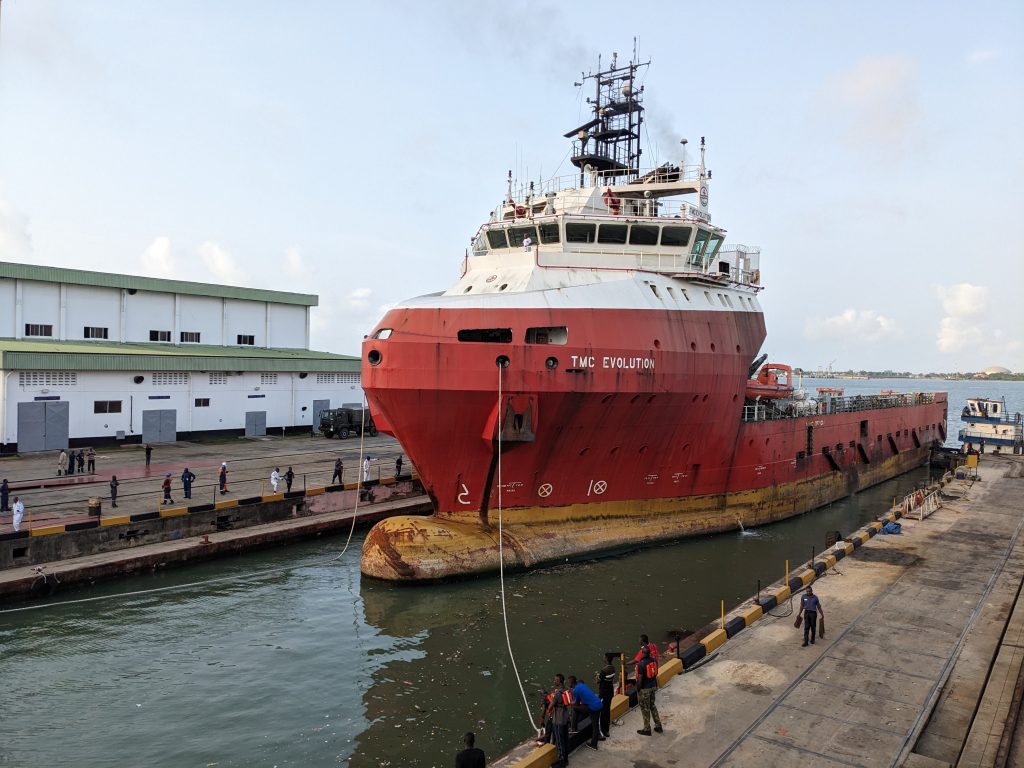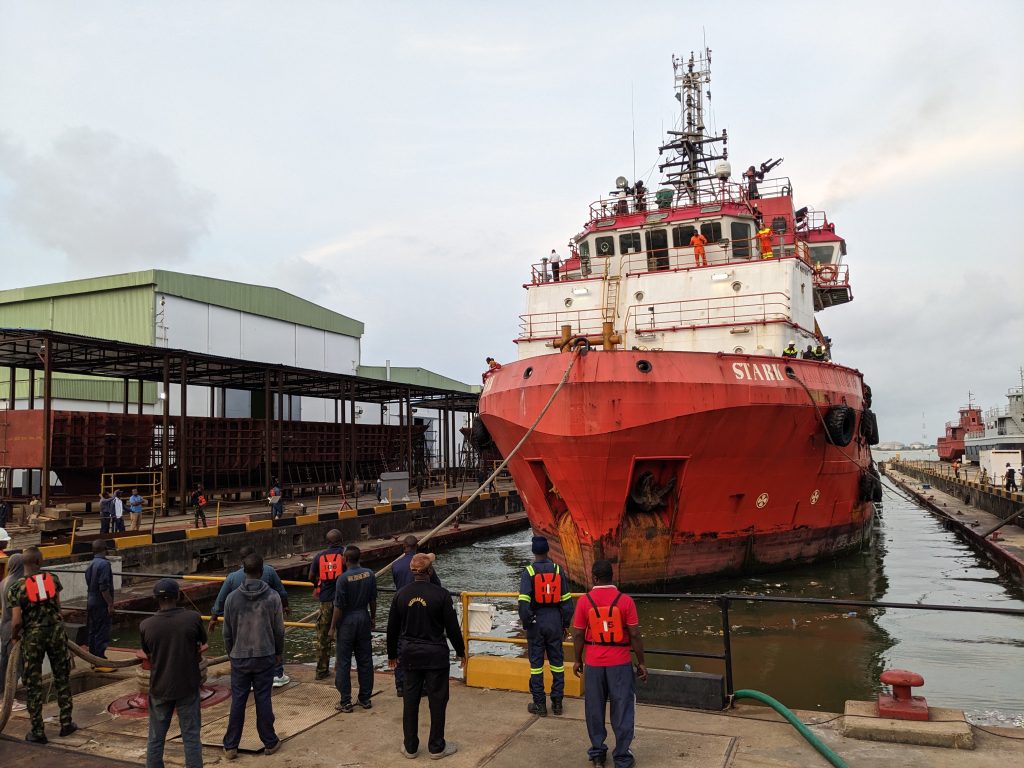 As the Hub of Naval Engineering in Africa, the Naval Dockyard is constantly contributing to promoting safety and efficiency of shipping and maritime related activities in Nigeria and beyond its shores. Part of the notable contributions are in the areas of providing quality, timely and cost-efficient docking and ship repairs of Naval and Merchant vessels. Particularly, the NDL simultaneously docked MV STARK and TMC EVOLUTION in its 10,000Ton Main Graving Dock for preservative and restorative repairs on bow thrusters, hull and Azimuth. Assuredly, the vessels would be restored to their designed efficiency by our team of experienced and skillful technical staff under a visionary and dynamic Management, ensuring the seaworthiness of the vessels towards promoting trade, commerce and investment in Nigeria’s Blue Economy. The NDL, therefore stands proud as one of the leading players and fully integrated facility for ship construction and repair in the Continent and the globe.