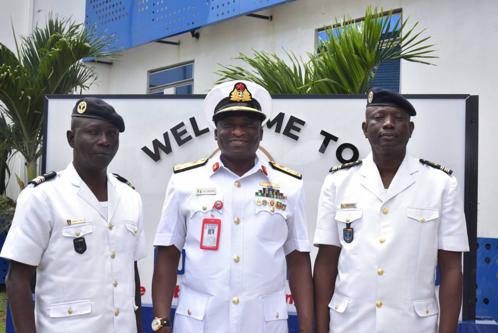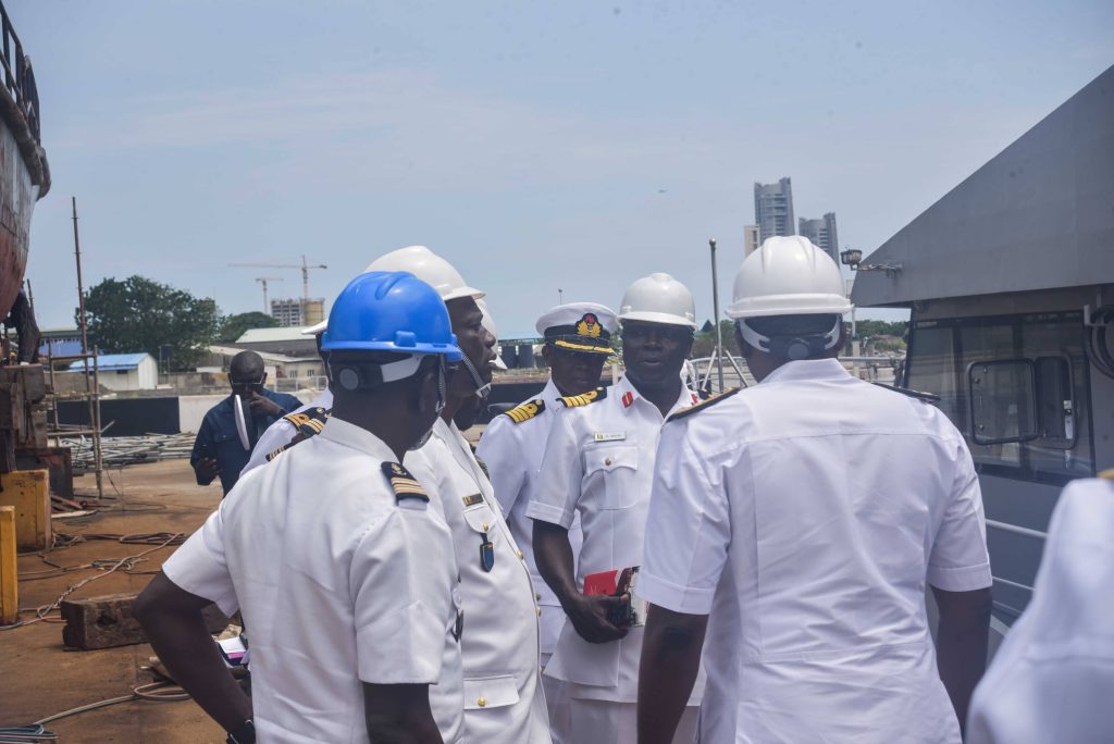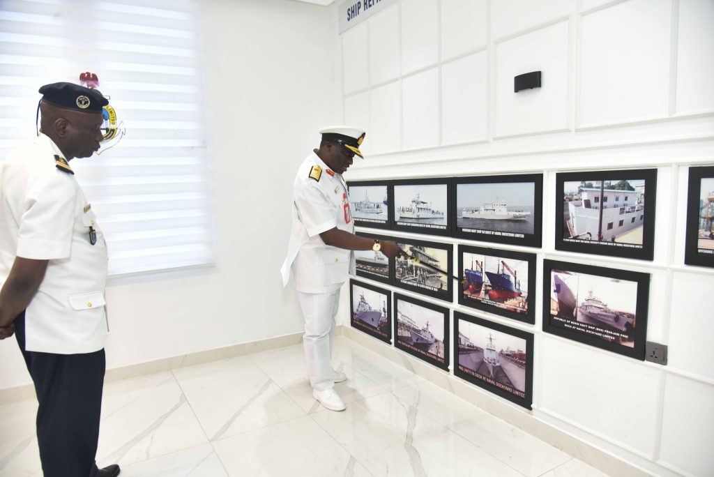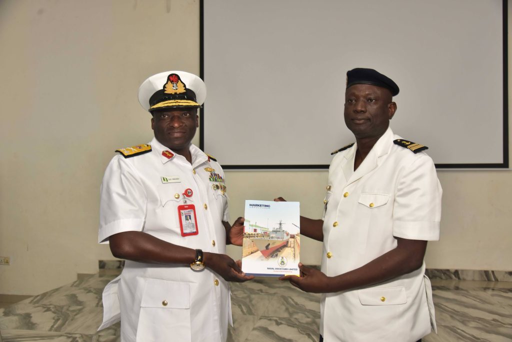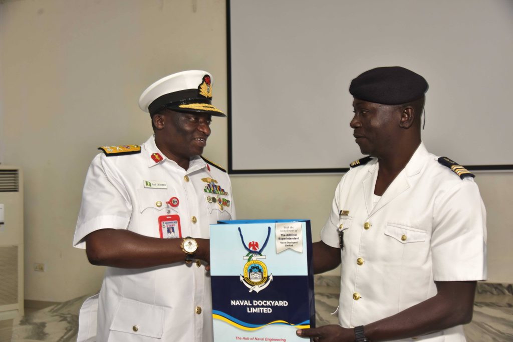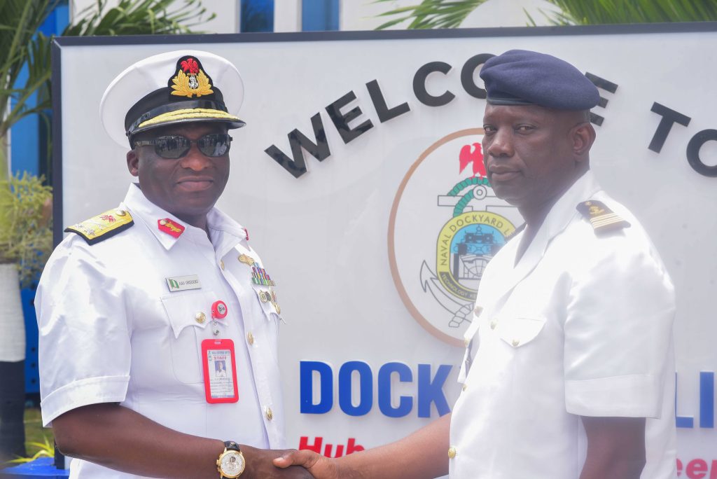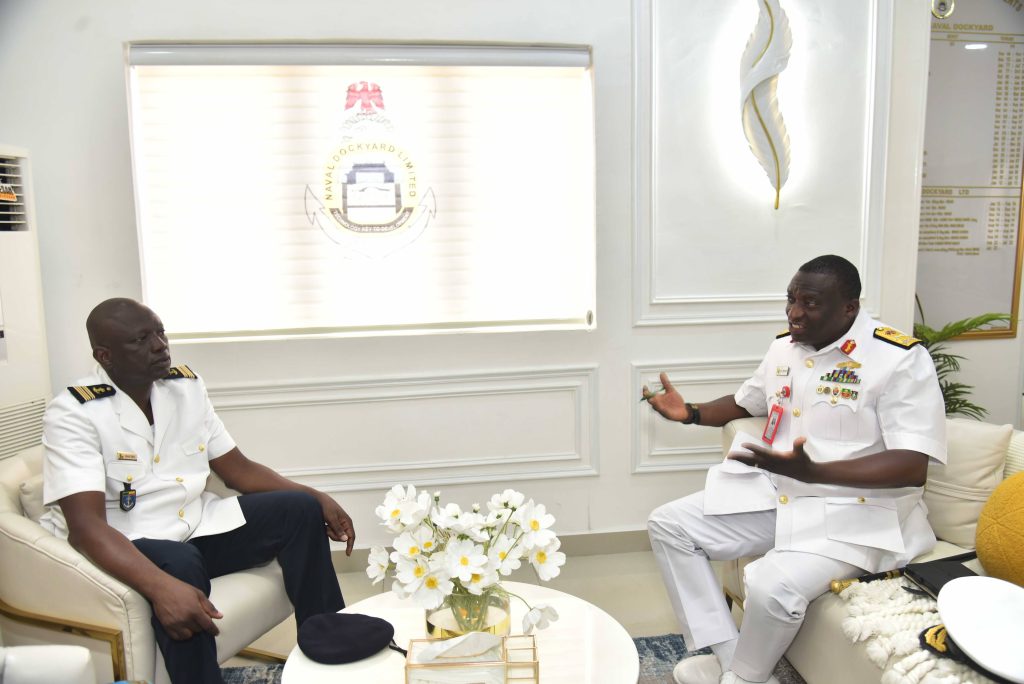The Deputy Chief of the Naval Staff (CNS), Republic of Benin, Navy Captain Sama Emile was at the Naval Dockyard Limited (NDL) to see the progress of work on the Republic of Benin Navy Ships. He was received at the Yard by the Admiral Superintendent Naval Dockyard Limited, Rear Admiral AA Orederu. The visit afforded the Beninese Nationale Navy Deputy CNS an on the spot assessment of the ongoing repairs and maintenance of 3 naval ships in the Yard. Navy Captain Sama commended the NDL for the marvelous work carried out on his country’s naval ships and is confident the ships will be back to the fleet for operations. The Admiral Superintendent Naval Dockyard Limited appreciated the visit and promised that the ships would return to the fleet in a better operational state. The visiting Chief was taken on a guided tour of the NDL facilities.